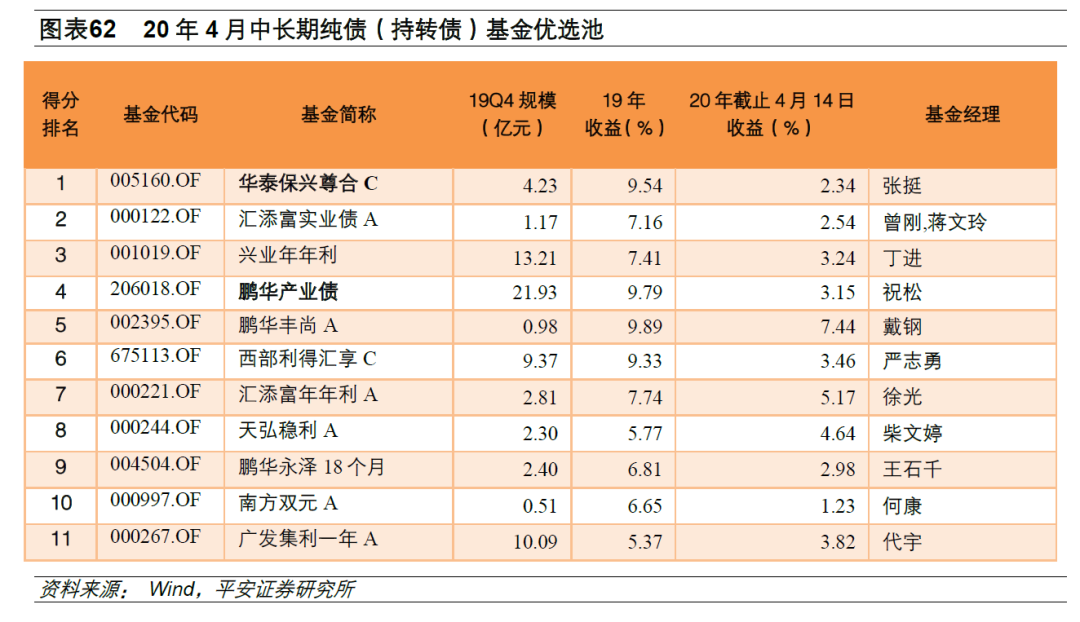 鹏华产业债(206018.OF):成立于2013年2月6日,19年Q4规模21.93亿元,成立日到20年3月31日收益62.42%,同类型排名前10,业绩波动排名前10。该基金在可转债上的管理能力突出。投资风格稳定,偏向于买入并持有中高评级信用债,19年久期偏低,可转债换仓较频繁。基金经理祝松从业经历非常丰富,具有6年多的债券基金经理管理经验。所属基金公司鹏华基金在固收上综合实力较强。