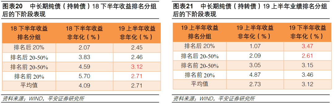 3)中长期纯债(持转债)基金的标准差指标有较好的持续性,最大回撤指标一般。19年前后半年(样本少,95只)散点图发现:标准差散点分布在对角线上下20%的区域内,最大回撤散点特征不明显;密集区域都比较明显。标准差的相关性更好(0.5762),最大回撤相关性一般(0.3795)。