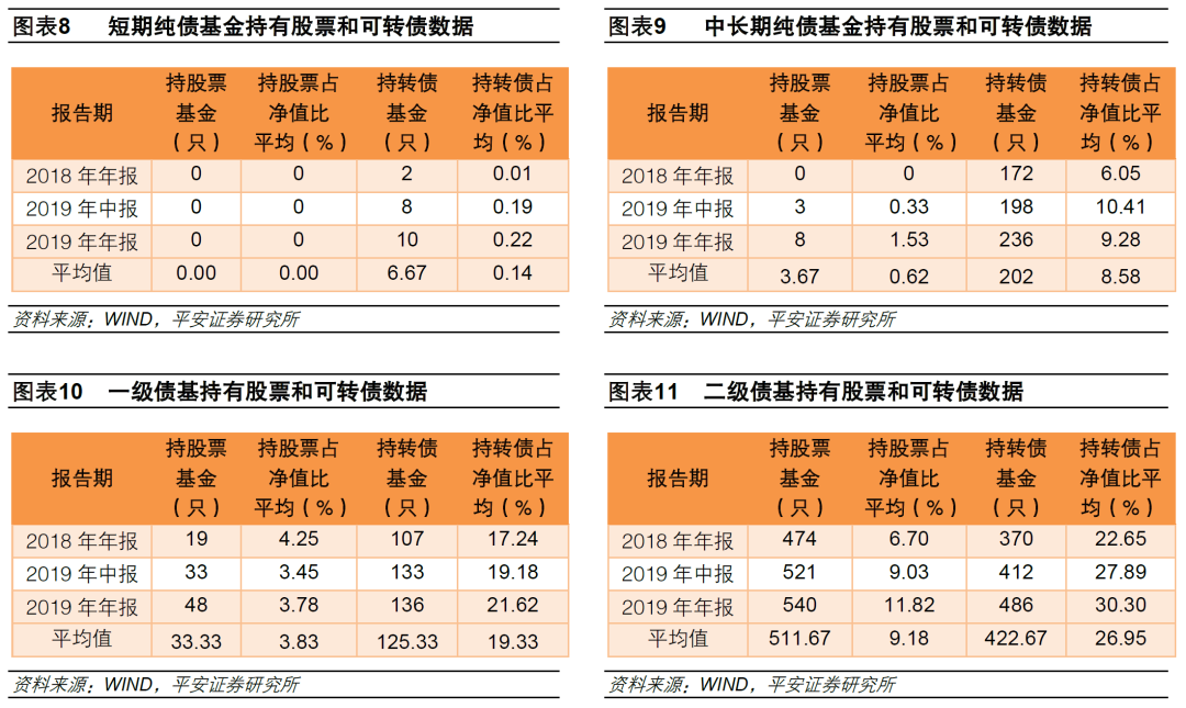 债券类基金的投资对象既包含了国债、金融债、企业债等低风险品种,也包含了可转债和股票等高风险品种。1)短期纯债不持有股票,持有的可转债非常少,几乎可以忽略不计。2)中长期纯债几乎不持有股票,但持有一定的可转债。3)一级债基持有股票少,但可转债较多。4)二级债基19年年报股票和可转债合计占净资产42%。