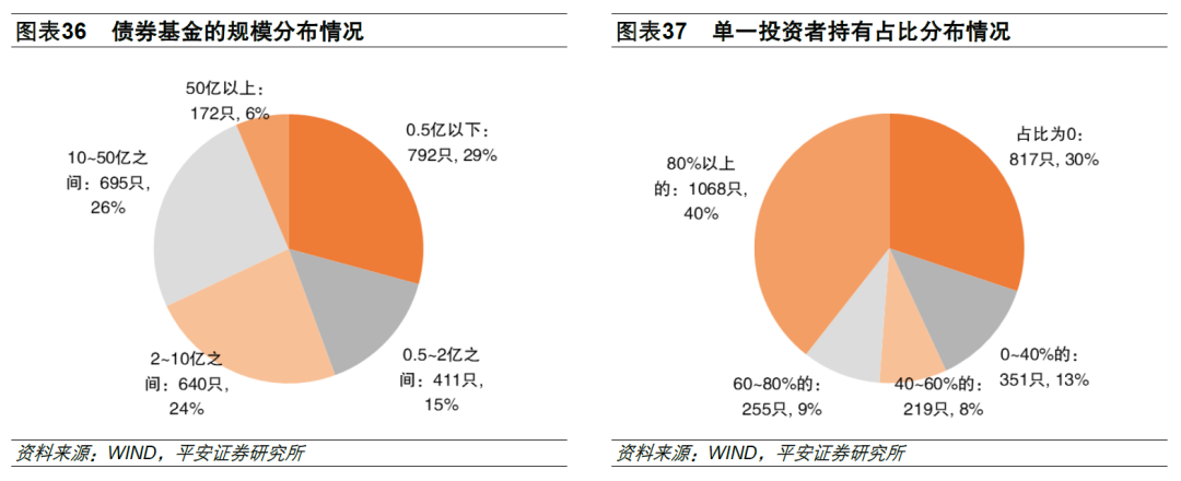 在对基金进行业绩评价研究的时候,还需要关注流动性风险。从流动性角度看,基金规模小、机构投资者占比过大、单一持有人持有比例过高的基金,都是需要回避的对象。从全部债券基金19年Q4的数据看:1)规模偏小(0.5亿元以下)的有792只,占比达到29%,0.5~2亿元之间的也有411只。2)很多债券基金都是机构定制,单一投资者持有占比60%以上的达到49%,40~60%之间的也有8%,只有30%的基金不存在单一投资者占比超过20%的情况。从流动性来看,基金优选的时候,回避规模小于0.5亿元,单一投资者持有占比超过60%,机构投资者占比超过80%以上的债券基金。