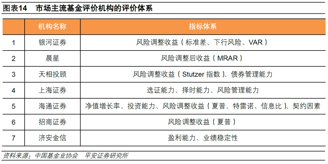 公募基金的公开评价主要以量化形式进行,核心是对基金的业绩、业绩的来源和业绩的持续性进行分析。在国内公募基金市场上,以银河证券、晨星(MorningStar)、天相投顾、上海证券、海通证券、招商证券、济安金信等为代表的基金评价机构均推出了各自的基金评价体系。整体上看,这些机构的评价体系采用的多是指标综合打分的量化模式:1)对基金进行分类,每类确定不同的评价指标;2)按照评价指标,对每个类型的基金进行计算和评分;3)对指标得分按照权重求和,获得综合评分;4)按照得分高低,再结合一些定性分析,进行最后的评级。
