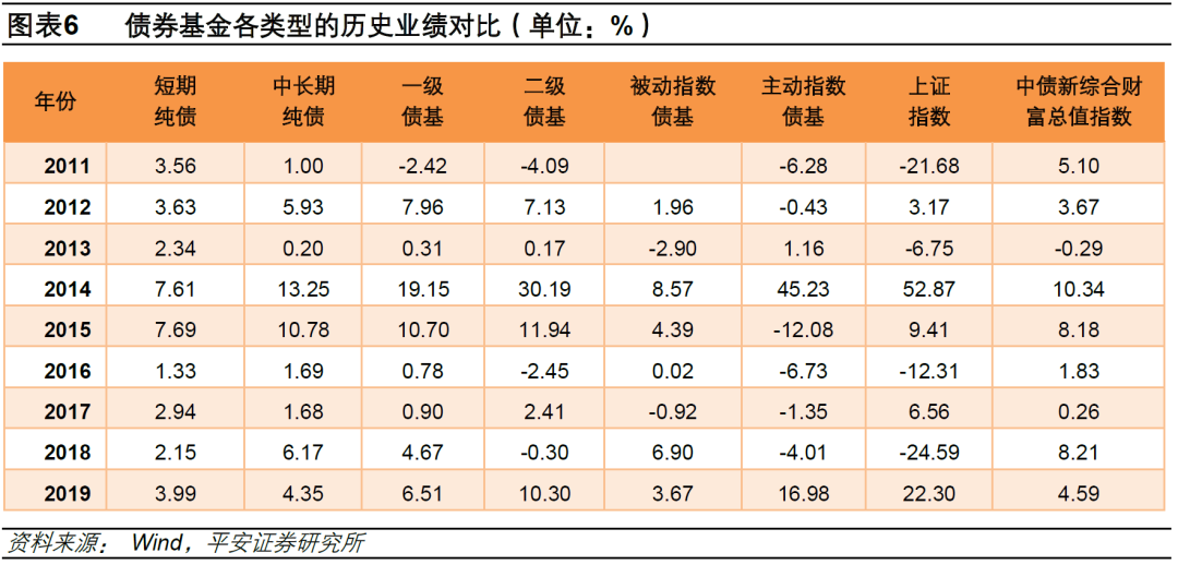 各子类型债券基金由于各自投资的品种和比例不同,造成业绩差别也较大。根据11年到19年各类型债券基金的收益分析:1)纯债基金的收益和债券市场的走势紧密相关,其中中长期纯债基金由于持有的是期限较长的债券,业绩相对更好;2)一级债基持有股票少,业绩介于股票市场和债券市场之间,近几年的业绩走势更偏向于纯债基金,主要原因是打新业务下降,债券资产比例更高。3)二级债基由于持有了部分权益资产,业绩特征也和股票市场紧密相关,波动大。