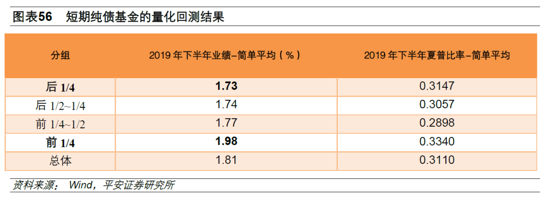 67只短期纯债按照2019年上半年的数据计算总得分,然后排序平均分成4组,对每组基金在2019年下半年的收益和夏普比率值进行简单平均。从结果来看,所选因子和量化模型可以有效的选择出未来一年业绩优异的基金:1)按照业绩来说,前期综合得分越高,后期业绩越好,表现出非常明显的分层。2)从风险调整后收益来看,前期综合得分越高,后期夏普比率基本表现较好,但是没有表现出非常明显的分层。