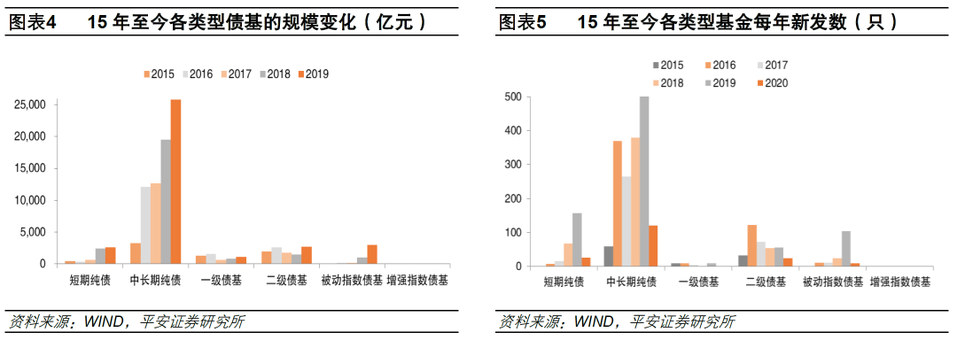 分析2015年至今各类型债券基金的发行数量和规模:1)18年开始的债券牛市,加速了短期纯债基金的发展,规模从17年的600亿元增长到19年的2665亿元。2)截止19年Q4,中长期纯债基金从数量(1928只,A/B/C类单独统计,以下规则同)到规模(2.58万亿),都在债券类基金中占有绝对地位,如果加上短期纯债基金的规模,纯债基金这一类型占据债券类基金的主导地位。3)一级债基在取消一级市场网下打新资格后,发展几乎停滞,成为市场边缘品种。4)二级债基的整体规模变化不大,但每年依旧保持一定的发行数量(19年发行56只)。5)受益于近两年资产配置的需求,被动指数债基发展迅速,规模近3000亿元,19年发行105只,已经成为债券基金第二大品种。