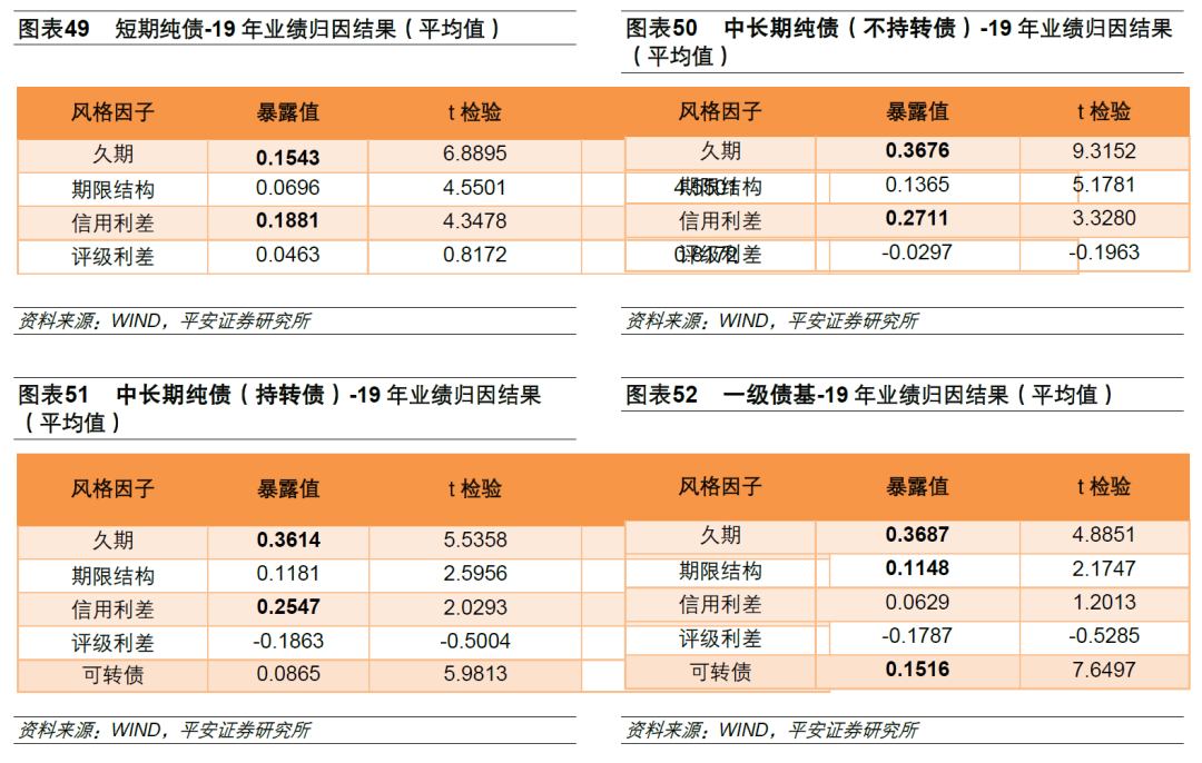 1)久期因子是债券基金的最主要暴露值。说明对债券类基金来说,收益很大一部分都来源于国债效应,也同时说明国内的债券基金经理普遍具备较好的久期管理能力。