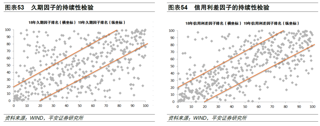 从结果看久期因子和信用利差因子均有很好的持续性:1)散点基本上都分布在对角线上下20%的区域内,其中信用利差因子几乎完全在对角线附近,散点图的数据密集区在两个图都比较明显的分布在左下角底部区域和右上角顶部区域。2)从相关性看,久期因子相关系数0.4863,信用利差因子相关系数达到0.6655。