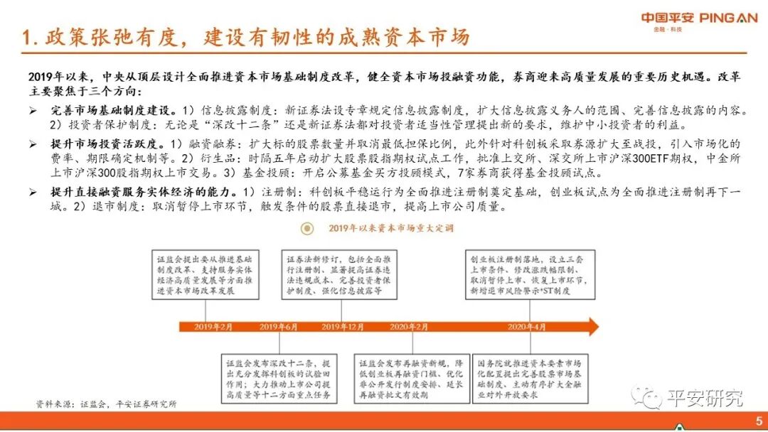 2019年以来,中央从顶层设计全面推进资本市场基础制度改革,健全资本市场投融资功能,券商迎来高质量发展的重要历史机遇。改革主要聚焦于三个方向: