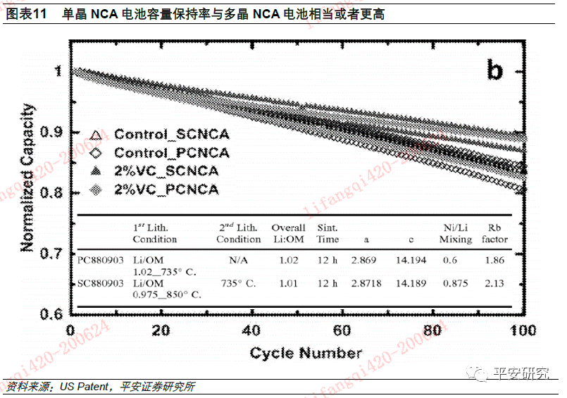 采用单晶正极材料打造长寿命电池的思路已经体现在特斯拉电池研究合作伙伴Jeff Dahn团队于19年发表的论文中,文章中提到下一代单晶NCM阴极和新型电解质组成的新型锂离子电池可以使电动汽车中的电池组使用寿命超过160万公里(百万英里)。我们认为单晶NCM或单晶NCA将是特斯拉即将推出的百万英里电池的重要组成部分之一。