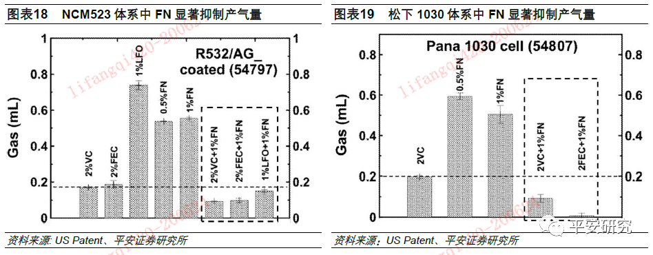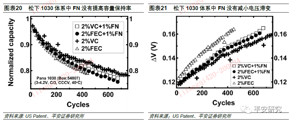 2019年12月12日,特斯拉公开了一项名为《包含FN的双添加剂电解液体系的新型电池系统》的专利,专利将传统的VC添加剂与新型添加剂FN混合,观察该电解液体系对电池性能的影响,并得出以下结论(适用于NCM523和松下1030型号电池):