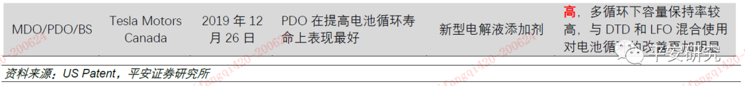2019年12月12日,特斯拉公开了一项名为《包含ODTO的双添加剂电解液体系的新型电池系统》的专利,专利将传统的添加剂与新型添加剂ODTO混合,观察该电解液体系对电池性能的影响,并得出以下结论(适用于正极包覆和未包覆的NCM523/622以及松下1030型号电池):