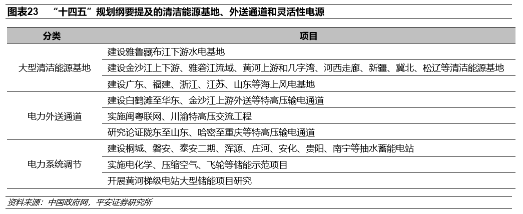 电力生产端:以新能主的可再生能源替代。中央财经委第九次会议指出,要构建以新能源为主体的新型电力系统,也就基本明确了新能源未来的主力电源地位;未来陆上新能源的开发将是“风光并举”的模式,旨在寻求系统最优,光伏和陆上风电均具有较好发展前景;海上风电是我国未来新能源基地的重要组成,未来发展前景广阔。在“碳达峰、碳中和”战略的引领之下,我国将从以煤电为主的电源结构向以新能源为主的电源结构转变,到十四五末我国光伏、风电的总装机规模有望较2020年实现翻倍增长;从新增装机角度看,2021年国内合计的风电、光伏新增装机量有望超过0.9亿千瓦,整体判断十四五期间国内光伏和风电新增装机将呈现平稳增长的态势。随着电源端从以火电为主逐步转变为以新能源为主,需要构建以新能源为主体的新型电力系统与之配套;一方面,需要提前布局相关的输送通道以满足新能源大基地的电力外送需求,另一方面,为满足高比例新能源接入带来的调峰需求,以抽水蓄能、电化学储能为代表的储能产业有望加快发展。