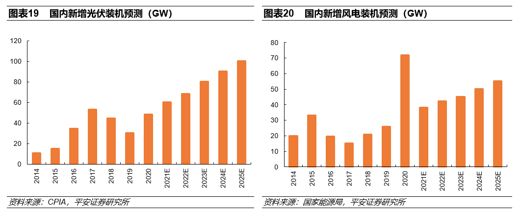 基于十四五期间用电需求增速平稳以及新能源在增量电力环节逐步对煤电进行替代等假设,整体判断十四五期间国内光伏和风电新增装机将呈现平稳增长的态势。