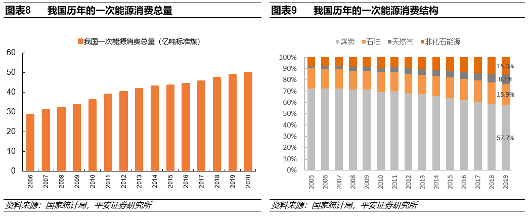 从我国能源消费端看,2020年全国一次能源消费总量约49.8亿吨标准煤,同比增长约2.3%。非化石能源消费占比近年来持续增长,到2019年升至15.3%,已提前完成到2020年非化石能源消费比重达到15%左右的目标。根据《中华人民共和国国民经济和社会发展第十四个五年规划和2035年远景目标纲要》,到2025年非化石能源占能源消费总量比重提高到20%左右;按照中国政府承诺,到2030年,这一指标将提升到25%左右。