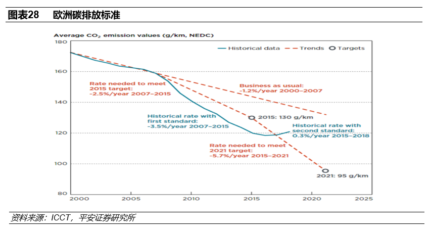2020年9月,《欧盟绿色协议》更新了《2030年气候目标计划》草案,提出2030年乘用车每公里二氧化碳排放需减少到2021年的50%,即47.5g/km,比原先59.4g/km的目标下降了20%,欧盟节能减排法规不断收紧,电动化势在必行。未达排放标准的厂商将面临巨额的罚款,因此各主机厂面临着新能源转型的压力。