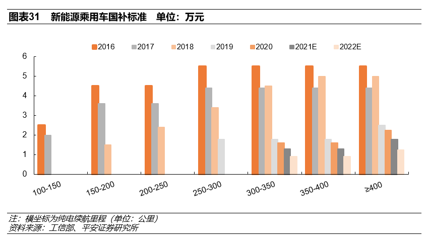 国内现行的新能源汽车支持政策主要包含政府补贴、双积分、牌照路权等,补贴政策原定于2020年后退出,因疫情和补贴退坡过快影响到推广进程,2020年国内出台政策将补贴期限延长至2022年底,原则上2020 -2022年补贴标准分别在上一年基础上退坡10%、20%、30%;城市公交、出租网约车等符合要求的公共运营车辆,2020年补贴标准不退坡,2021-2022年分别在上一年基础上退坡10%、20%。