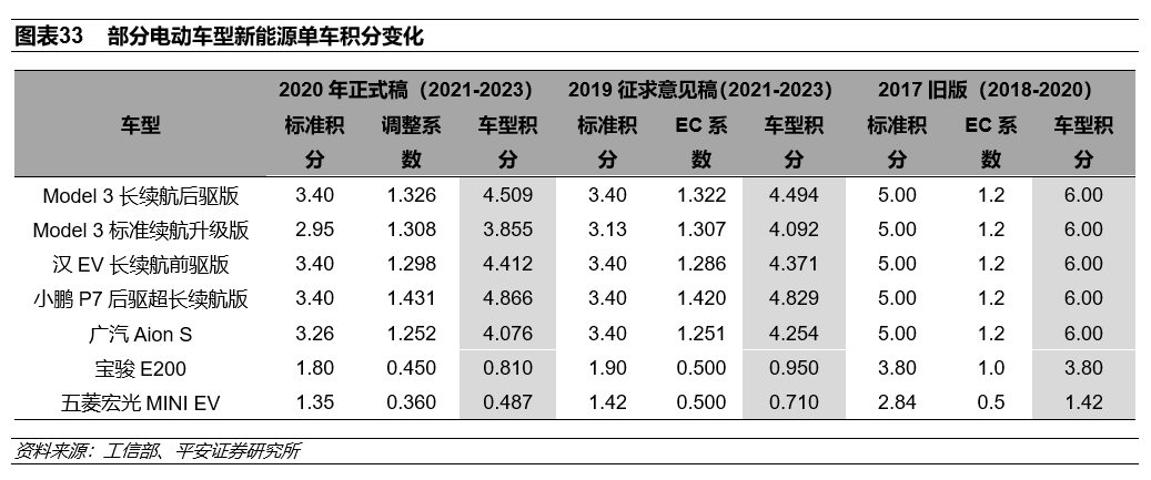 与2019年征求意见稿和2017年旧版双积分政策相比,此次正式稿在单车可获得积分上有如下变化:1)降低相同续航里程下的标准积分;2)增加调整系数的组成;3)中高端车型可获得更高的电耗调整系数。国家在政策制定上更加往中高端车型倾斜,引导国内电动车产品的升级。