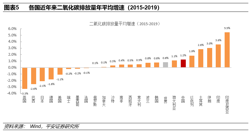 与此同时,我国的二氧化碳排放量仍处于上升趋势,从近5年碳排放量的年平均增速来看,中国碳排放平均增速为1.2%,高于全球0.8%的水平,部分主要经济体(如英国、巴西、日本、德国、美国、墨西哥、法国)的碳排放量增速已经降为负值。
