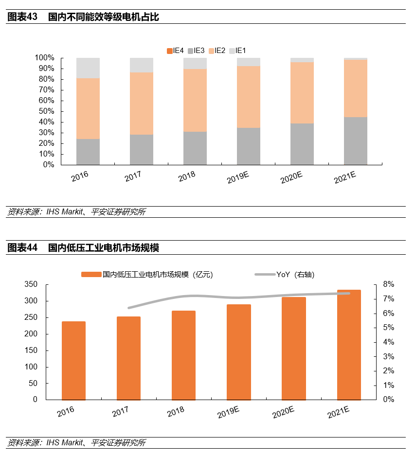 从工业用户对高效电机的采购成本来看,IE3高效电机平均价格比普通电机高15%左右,故在标准实施之初替代相对缓慢。目前随着国家环保监督措施愈发严格,加上碳中和政策对单位GDP能耗降低的硬性要求,我们预计未来IE3高效电机的渗透率将加速提升。除了政策对节能的要求之外,在工业电机国家强制标准层面,2020年5月国家标委会批准公布了最新的电机能效强制标准,该标准将在2021年6月开始实施,届时IE3以下能效等级的标准工业电机将强制停产,意味着工业用户新增购买的电机都将为高效电机,推动IE3电机的渗透率加速提升。
