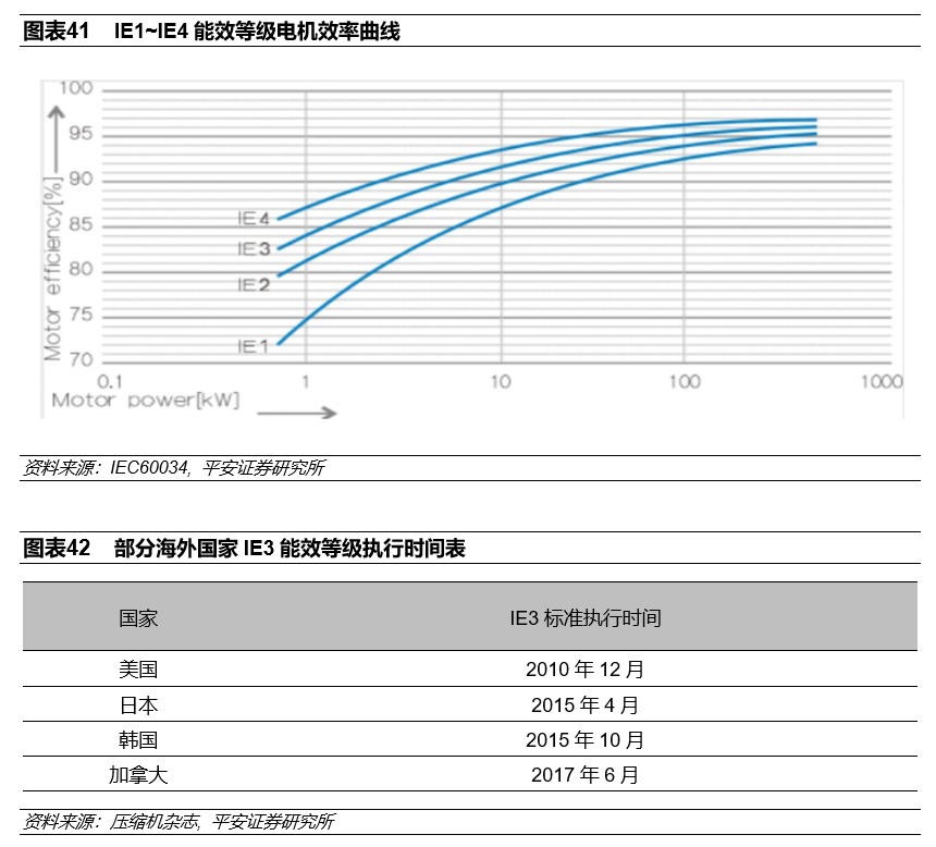 目前市场主流高效电机的效率等级为IE3,相比普通电机能效可以提升超过4个百分点,海外国家中美国已于2010年底强制要求工业电机满足IE3能效等级标准。国内对高效电机的推广应用相对滞后,尽管在产品层面主流电机企业均有满足IE3能效等级的产品,但是由于成本等原因,国内从2017年初才开始推广IE3能效等级标准。