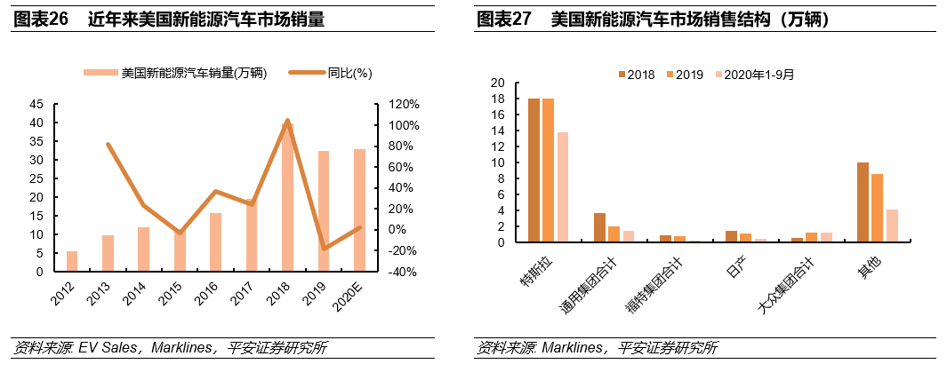 美国2014-2018年新能源汽车销量增速相对稳健,2019年同比下滑18.55%,主要原因为美国政府对于减排法规的相对放松一定程度影响了主机厂的电动化进程,进而影响了车型的供应。预计拜登政府将积极推行清洁能源革命计划,大幅提高美国新能源汽车渗透率。美国作为石油输出国、页岩油大国,在特朗普政府“美国优先”战略下,政策层面对新能源汽车的推动力度较弱;拜登则与奥巴马一脉相承,坚定支持新能源产业发展。