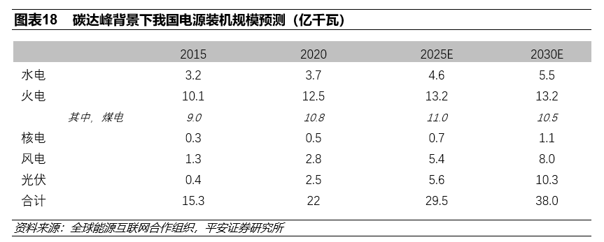 在2030年前实现碳达峰的目标指引之下,新能源的开发节奏与达峰时间、峰值的碳排放量以及用电增速等诸多因素有关。参考全球能源互联网合作组织的情景假设,即2028年实现碳达峰、峰值的二氧化碳排放量约109亿吨、当年非化石能源占一次能源消费占比约27%,在此情景之下煤电机组装机规模将在2025年达峰,后续煤电装机规模开始回落。