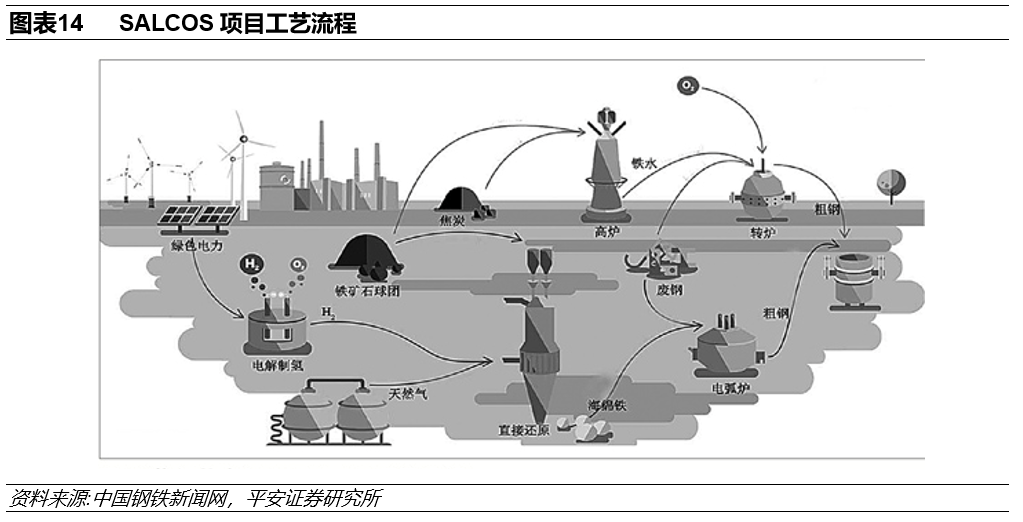SALCOS项目旨在对原有的高炉-转炉炼钢工艺路线进行逐步改造,把以高炉为基础的碳密集型炼钢工艺逐步转变为直接还原炼铁-电弧炉工艺路线,同时实现富余氢气的多用途利用。