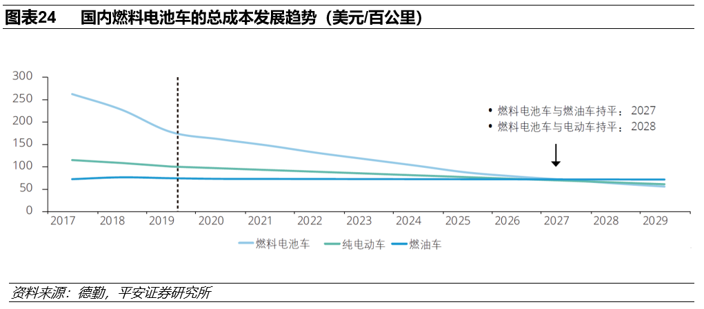 根据德勤的分析,中国氢燃料电池公交车的总成本(TCO,购买成本和运营成本)在2019年为178美元/百公里,预计到2029年TCO将下降至55美元/百公里,将低于纯电动公交和燃油公交车的成本。