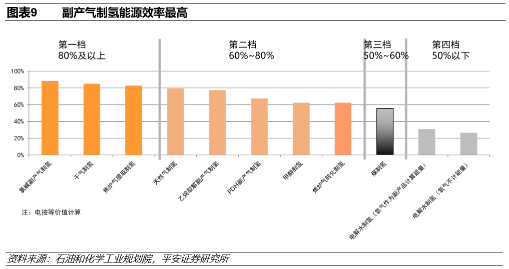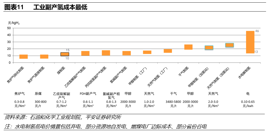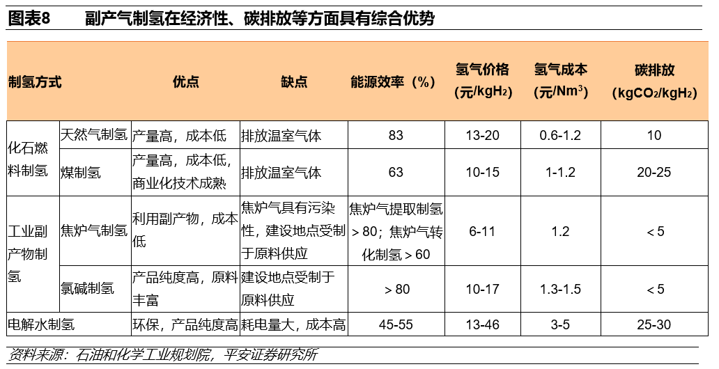 焦炉气、氯碱、丙烷脱氢制丙烯和乙烷裂解制烯烃副产的粗氢气可以经过脱硫、变压吸附和深冷分离等精制工序后作为燃料电池车用氢源,成本远低于化工燃料制氢、甲醇重整制氢和水电解制氢等路线。