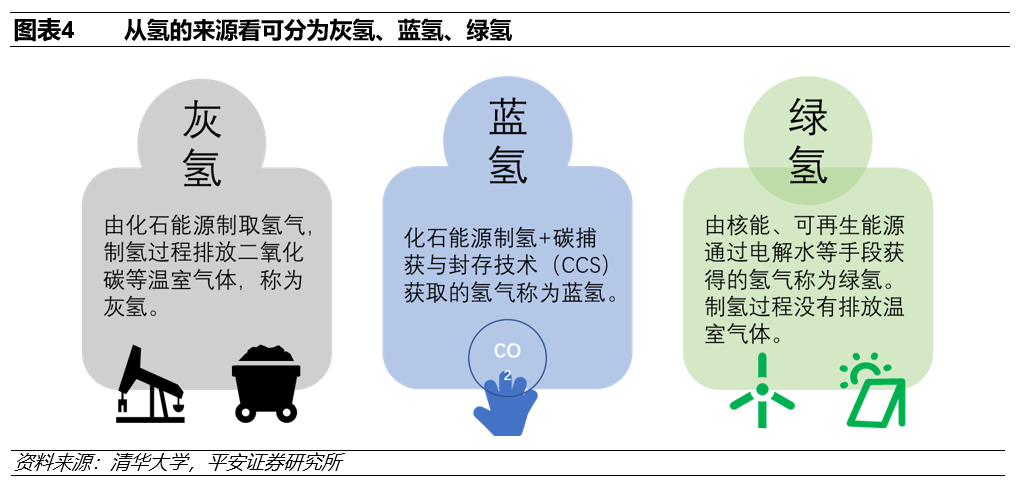 氢能源按生产来源划分,可以分为“灰氢”、“蓝氢”和“绿氢”三类。“灰氢”是指利用化石燃料石油、天然气和煤制取氢气,制氢成本较低但碳排放量大;“蓝氢”是指使用化石燃料制氢的同时,配合碳捕捉和碳封存技术,碳排放强度相对较低但捕集成本较高;“绿氢”是利用风电、水电、太阳能、核电等可再生能源电解制氢,制氢过程完全没有碳排放,但成本较高。目前,我国氢气主要来自灰氢。