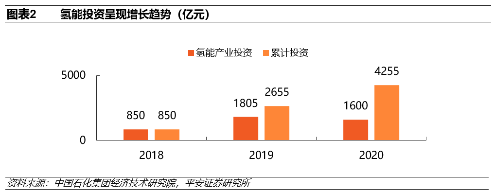 氢能是替代化石能源实现碳中和的重要选择:氢能已经成为应对气候变化、建设脱碳社会的重要能源。欧、美、日、韩等发达国家纷纷制定氢能路线图,加快推进氢能产业技术研发和产业化布局。氢能产业已成为我国能源战略布局的重要组成。2019年氢燃料电池产业相关投资及规划资金1805亿元。尽管受到疫情影响,2020年氢能投资金额仍有1600亿元,市场对于氢能产业依旧充满信心。