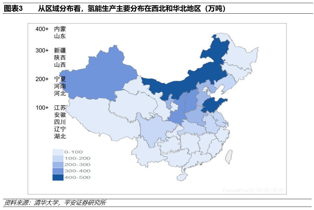 从区域分布看,氢能生产主要产生在西北和华北地区,根据2019年数据,产量超过400万吨的省份有内蒙和山东,产量超过300万吨的省份有新疆、陕西和山西,产量超过200万吨的省份有宁夏、河南和河北,产量超过100万吨的省份有江苏、安徽、四川、辽宁和湖北。