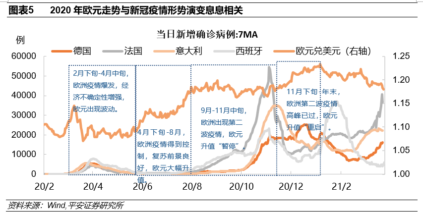 3、欧元走势与欧美的疫情演变息息相关(图表5)。2020年2月下旬,意大利首先受到新冠肺疫情波及,随后疫情在整个欧洲蔓延,各国纷纷采取防控措施,欧元区经济活动停滞,经济前景不确定性增强,欧元兑美元出现一定程度的波动。欧洲疫情在3月中下旬到达高峰后逐步收敛,4月下旬基本得到控制,再加上随后欧盟各国领导人协商推进7500亿欧元的财政刺激,欧元区经济复苏前景良好,欧元大幅走高,在4月底-8月底这4个月时间内,欧元兑美元从1.0934升至1.1950。但8月开始疫情再次抬头,欧元的升值步伐被按下“暂停键”。11月下旬欧洲疫情高峰已过,而美国疫情依旧“不见天日”且有大选政治因素干扰,相比之下欧元区经济复苏步伐更快,推动欧元升值按下“重启键”。欧元走势与欧洲疫情发展和防控密切相关,本质上是疫情演变影响欧元区相对经济表现和前景,从而对欧元对美元汇率产生影响。