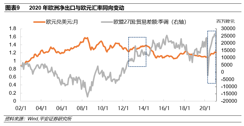先来复盘一下历史上的欧元升值。在2020年的大幅度升值之前,欧元共经历了6段升值周期(图表8)。1)2002年初-2004年末:2002年1月1日欧元开始正式流通,市场充分看好欧洲经济前景(欧盟28国来自欧盟内部的进口占比为64.6%,出口到欧盟的占比为67.9%,欧盟内部贸易量占比较大,货币一体化能够有效降低交易成本),欧元的流通也对美元的国际地位造成一定冲击,欧元兑美元大幅升值。2)2005年中-2008年初以及2016年末-2018年初:这两个时段欧元升值的驱动因素主要是欧洲相对美国经济的表现,对应花旗经济意外指数(欧洲-美国)有较大幅度的上行。3)2008年末-2009年初、2010年中-2011年中以及2012年末-2014年初:这三个时点分别对应美联储的三次量化宽松。在全球金融危机之后,除了欧美经济的相对表现之外,欧美货币政策相对节奏也对欧元走势展示出了重要影响。为应对全球金融危机的冲击,美国分别于2008年11月、2020年11月和2012年8月开启3次量化宽松,欧美央行扩表速度的节奏差推动欧元兑美元走高。
