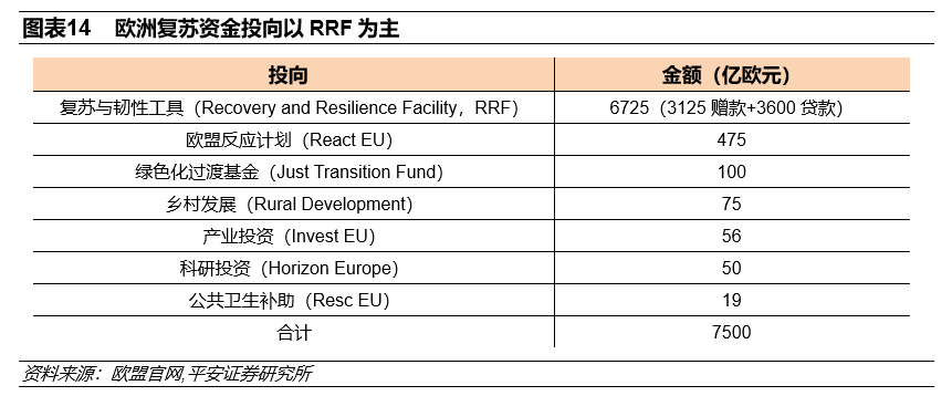 1)“怎么用”:复苏与韧性工具(RRF)占比近90%(图表14),意大利和西班牙最受“关照”。RRF的6725亿欧元资金的70%将于2021-2022年投放完成,按2015-2019年各国失业率平均水平分配;剩余30%于2023年投放完成,按2020-2021年各国GDP损失分配。各国最大贷款额不得超过自身国民总收入(GNI)的6.8%,各国需要提前提交资金使用预算方案至欧盟审核,通过后才能获得资金支持,并需要就资金使用接受欧盟监督。