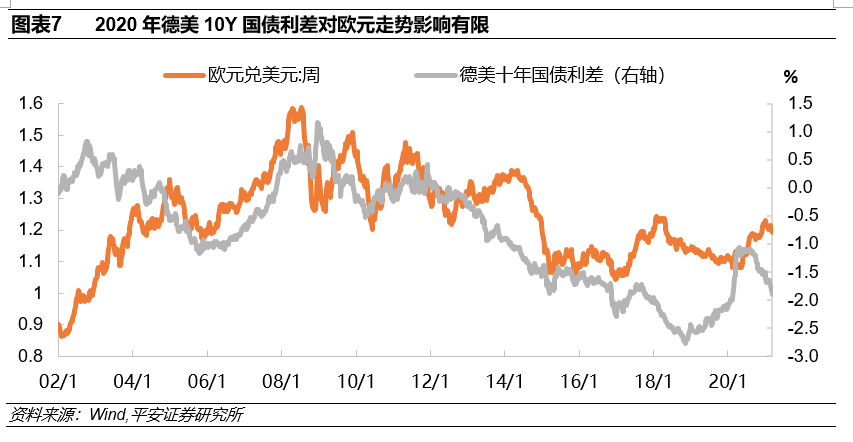 5)2020年美欧利差也未对欧元走势有显著影响。理论上,当德美10Y国债利差走高时,资本流入美国,欧元兑美元会呈下降趋势。历史上,上述传导关系得到了一定检验——在多数时候,欧元兑美元与德美10Y国债利差呈正相关,但并不绝对(图表7)。这一传导机制并不适用于2020年欧元升值的情况——欧元兑美元与德美利差呈负向关系。其原因可能在于,2020年疫情影响下美国疫情、经济表现不佳,市场对美国信心不足,从而即使美欧利差回升,美国资本市场也没有足够的吸引力获得资本流入,因此美欧利差与欧元汇率之间的常规传导机制受到限制。