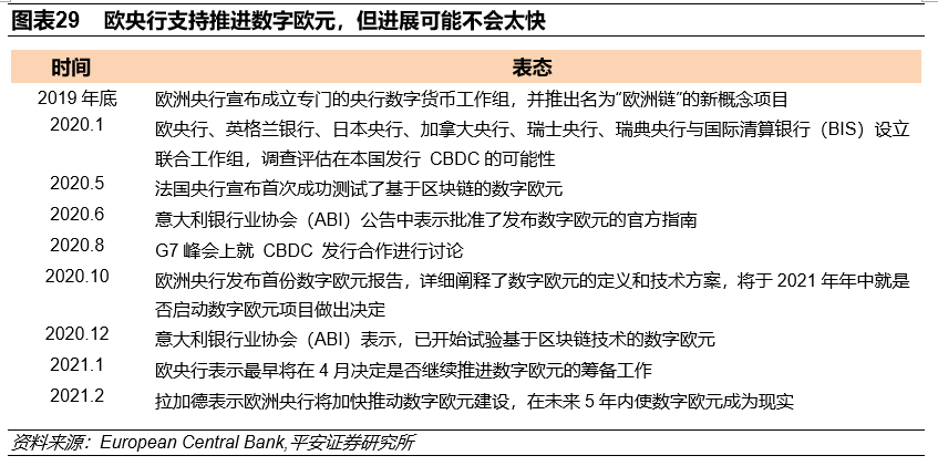 数字欧元的推进可能是为数不多的“亮点”,但其落地时间不会太早。2020年全球央行对数字货币(central bank digital currency,CBDC)的态度进一步开放,主要发达国家逐渐重视央行数字货币的研发。2020年1月,六家全球主要央行(欧央行、英格兰银行、日本央行、加拿大央行、瑞士央行、瑞典央行)与国际清算银行(BIS)设立联合工作组,调查评估在本国发行CBDC的可能性。