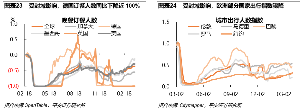 疫情再度抬头,疫苗推进滞后,给欧洲经济复苏带来不确定性。2021年2月中旬以来,德法意等国的新增新冠病例数量再度攀升,法国当日新增确诊病例一度突破40000人(图表22)。为应对此轮疫情,法国从3月19日起对包括巴黎在内的16个省份实施持续一个月的新一轮封锁,意大利自3月15日起实施全国性的封锁,德国几度延长封锁时间(此前已将封锁时间延长至3月28日,后又延长至4月18日)。OpenTable公布的晚餐订餐人数同比2019年变动情况显示,全球订餐人数同比降幅在不断缩窄,且美国降幅缩窄速度更快,但欧洲国家明显滞后,德国受封城影响,订餐人数同比几乎降至-100%(图表23)。Citymapper公布的城市公共交通出行情况显示,2020年下半年欧洲主要城市出行恢复明显好于美国,但自2021年3月欧洲多国宣布封城后,欧洲主要城市出行骤降,而美国仍保持稳健的恢复速度(图表24) 。