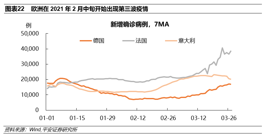 从新冠疫苗推进情况来看,欧洲疫苗接种也相对滞后。根据Bloomberg数据,截至3月31日,欧盟已接种至少1针疫苗的人口比例为10.9%,美国的这一数字为28.9%,将近欧洲的3倍(图表25)。我们在报告《美国离“群体免疫”还有多远?》中测算,基于当前的接种速度(约250万剂/日),美国可能在7-8月实现疫苗的大规模接种(覆盖65-75%人口),继而在8-9月实现“群体免疫”。反观欧盟国家,在当前接种速度下(约160万剂/天)粗算,在不考虑变异病毒干扰的情况下,到2021年8月底才能够覆盖半数人口,到年底才能够达到75-85%人口免疫,滞后美国3-4个月的时间。受疫情反复和疫苗接种速度缓慢影响,2021年欧洲经济复苏或难以实现大的突破。