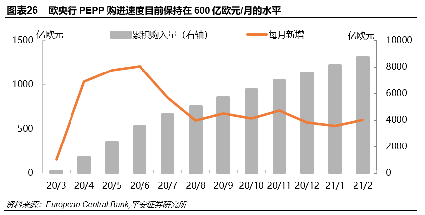 欧央行“鸽意”十足的政策态度可能进一步压制欧元。2021年3月的欧央行议息会议传达了关键要素,即“未来将在很长一段时间内保持货币宽松”。主要包括:1)维持当前利率水平不变(主要再融资操作利率0%、边际借贷便利利率0.25%水平和存款便利利率-0.5%),并预计未来将主要利率继续维持在当前水平甚至更低水平;2)提高下季度PEPP购进速度。此前在2020年下半年,欧央行放缓了PEPP的购进速度至每月千亿欧元以内,并一直保持在600亿欧元/月左右的水平(图表26)。3)欧央行还将2021年全年的通胀预期由1.0%上调至1.5%。但欧央行主席拉加德在会后的发布会上指出,1月和2月虽然通胀有所抬升,但是长期通胀预期仍然低迷。因此,欧央行称维持更长时间的货币宽松,也意在保护来之不易的通胀(图表27)。考虑到欧洲经济修复速度不及美国,欧央行大概率不会早于美联储收紧政策。