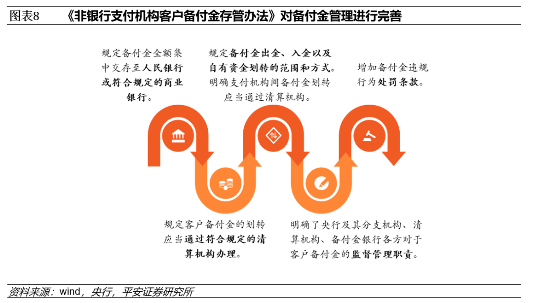 2021年1月22日,央行发布《非银行支付机构客户备付金存管办法》,并将于2021年3月1日起施行,《办法》主要细化了备付金存放、使用、划转的管理规定,同时明确央行及其分支机构、清算机构、备付金银行相应备付金管理职责,设定客户备付金违规行为处罚标准。2017年以前支付机构可以自主选择商业银行存放客户备付金获取高额的利息收入,但央行为防范支付机构挪用备付金风险,要求备付金逐步上缴央行,目前仅按照0.35%的年化利率按季度返还支付机构;截至2019年1月14日,非银支付机构已经完成客户备付金集中交存央行的工作。
