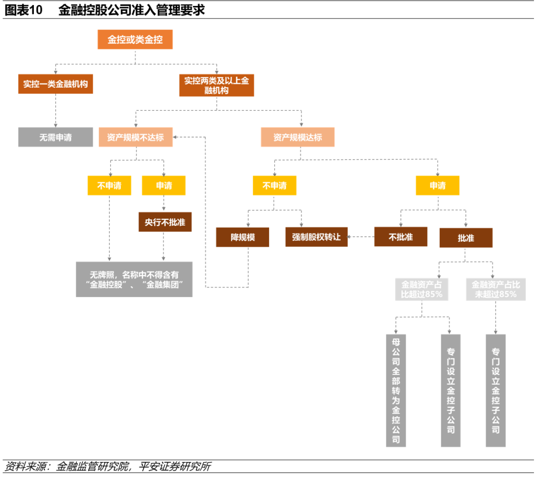 2020年9月国务院出台的《关于实施金融控股公司准入管理的规定》,正式授权央行对金融控股公司实施准入。此后央行随即发布《金融控股公司监督管理试行办法》,并于2020年11月开始实施,明确了金控公司的准入管理、股东和股本管理规范、股权结构要求等,同时提出金融控股公司、所控股金融机构以及集团整体的资本应当与资产规模和风险水平相适应,资本充足水平应当以并表管理为基础计算。
