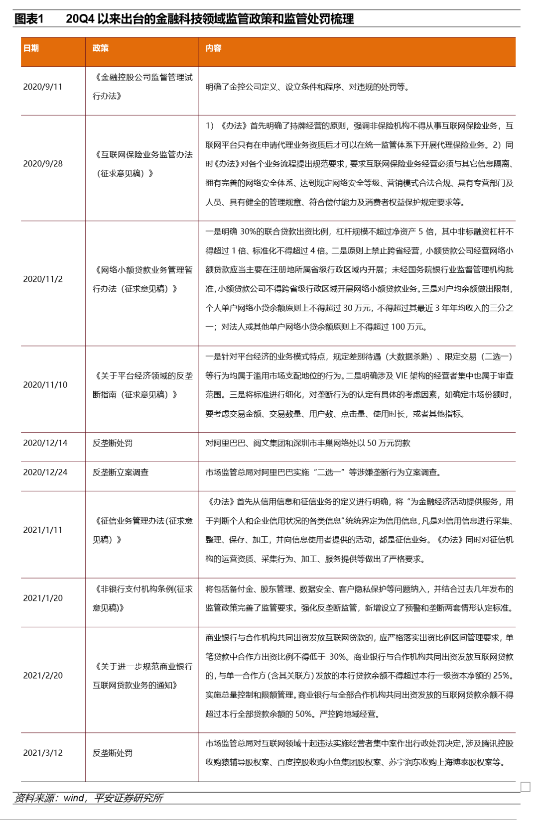 政策追踪:看齐传统金融,强化反垄断监管。20年Q4以来,围绕完善金融科技监管框架这一主线,监管部门发布多项暂行办法和相关规定,从政策内容来看,主要集中在3个方面:1)细化各业务监管要求,实行统一监管。银保监会明确“依法将金融活动全面纳入监管,对同类业务、同类主体一视同仁”,围绕这一政策基调,监管部门在互联网贷款、支付、线上保险、线上理财等各类业务上不断补位,细化管理要求。2)出台金控管理办法等框架型监管要求,约束资本无序扩张。《金控准入管理规定》和《金控监督管理试行办法》落地,聚焦防范非金融企业的无序、盲目扩张。3)强化大型科技平台的反垄断监管,《平台经济反垄断指南(征求意见稿)》出台,明确《反垄断法》的基本制度、规制原则和分析框架适用于互联网平台领域,对大型科技平台企业的反垄断监管全面趋严。