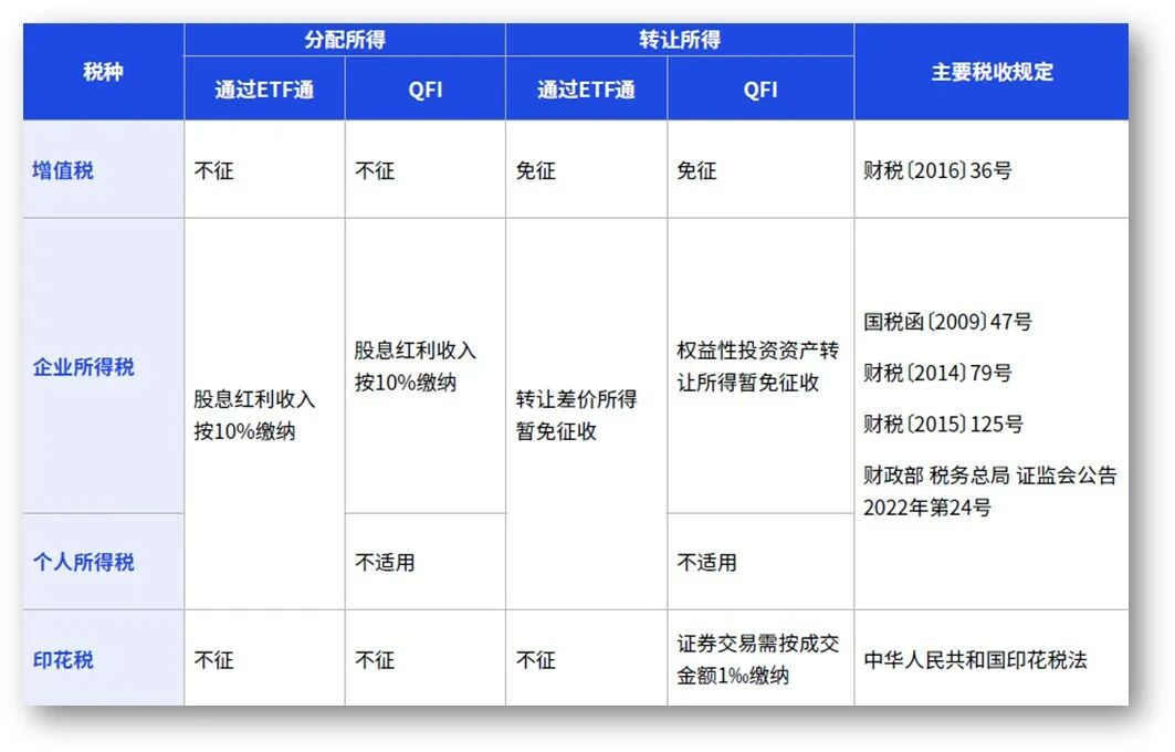 *注:以上税收分析和比较均基于(1)境外投资者不是中国税收居民,同时境外机构投资者在中国境内未设立机构、场所,或者虽设立机构、场所但取得的上述所得与其所设机构、场所没有实际联系;(2)不考虑中国与其他国家、地区签订的税收协定优惠影响;(3)通过北向ETF和QFI机制投资的分配所得与保本性投资不相关。