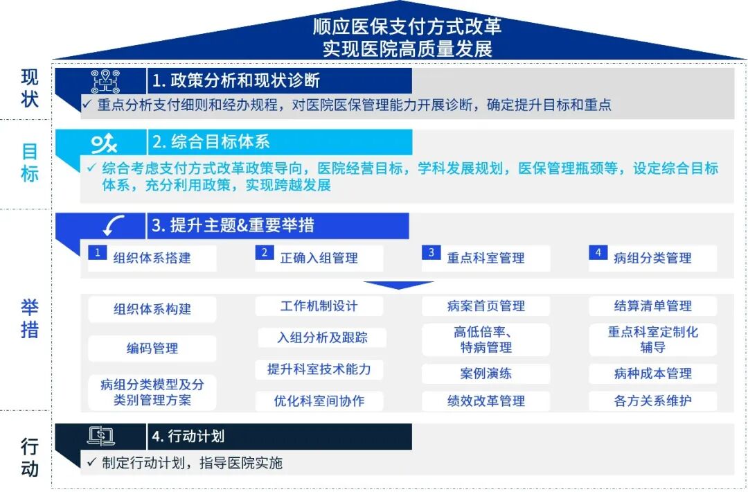 医保支付方式改革辅导方案的第二步是设立综合目标体系。综合考虑支付方式改革政策导向,医院经营目标,学科发展规划,医保管理瓶颈等,设定综合目标体系,充分利用政策,实现跨越发展。