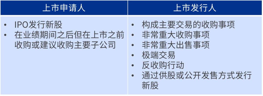 按照香港《上市规则》规定,在若干特定情况下发行人须列报备考财务资料,当中包括首次申请在联交所上市以及上市后进行的交易。下表概述了香港《上市规则》下通常须列报备考财务资料的情形。