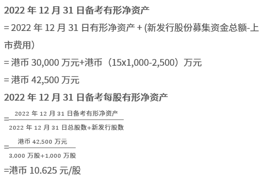 A公司计划于2023年6月于联交所上市,新发行股份1,000万股,每股发行价为港币15元,上市费用为港币2,500万元(假设所有费用均计入2023年)。A公司招股书中的业绩期间为2020年至2022年,其中A公司于2022年12月31日的有形净资产为港币3亿元,已发行股份为3,000万股。按照香港《上市规则》要求,A公司须在招股书中披露备考有形净资产及备考每股有形净资产。