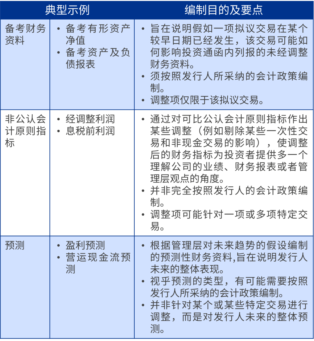 “备考”一词被广泛应用于金融市场,经常被用作代指一些非公认会计原则指标或预测。例如,非公认会计原则指标“经调整利润”有时被称为备考盈利。此类做法会导致投资者混淆何为备考财务资料。就香港监管环境而言,备考财务资料、非公认会计原则指标和预测存在明确差异,下面的表格可让读者厘清三者之间的差异: