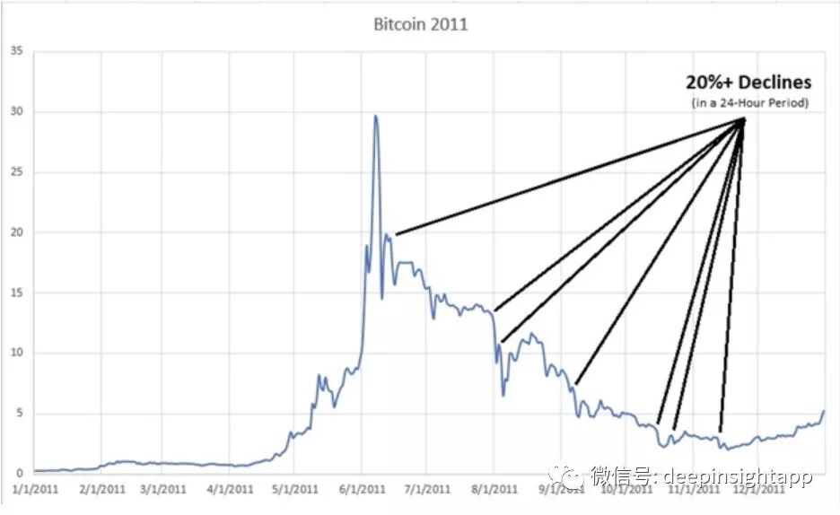 2011年开始的时候,比特币还只有0.3美元/币,到了6月8日那天触达到了31.5美元/币,在半年不到就取得了105倍的涨幅。然后不到一个月的时间内,比特币就暴跌到了11美元/币,再过了一个月不到又下跌到了7.8美元/币,然后继续回落到4.77美元/逼。也就是说,在90天的时间内,比特币暴跌了85%。