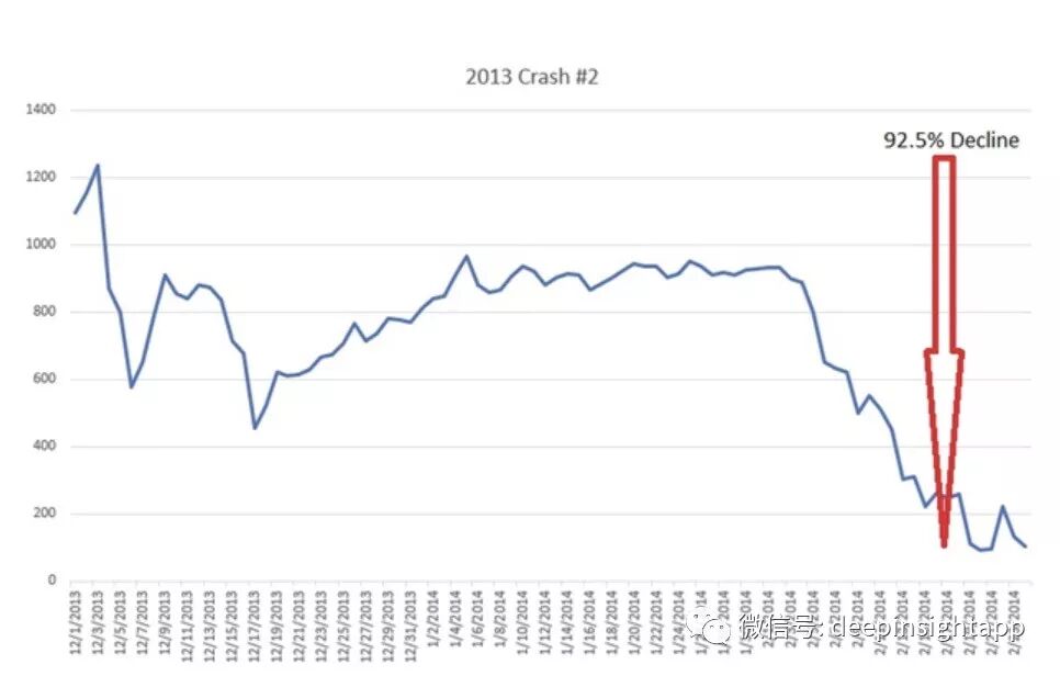 接下来则是2013年的Crash 2,也是比特币历史上最毁灭财富的一次下跌。之前我说过,2013年比特币的暴涨开始吸引大量的“人民币玩家”入场。甚至开玩笑的说,中国大妈开始入场扫货了,带动了2013年那波比特币的“主升浪”。但是到了12月5日,以中国央行为首的监管部门联合印发《关于防范比特币风险的通知》(以下简称“《通知》”),明确指出比特币不是货币,不应作为货币在市场上流通使用,普通民众在自担风险的前提下拥有参与的自由,各金融机构和支付机构不得以比特币为产品或服务定价。这个通知也导致了比特币出现了历史上最大一次暴跌:在83天之内,比特币价格暴跌92.5%,几乎毁灭了这个市场。
