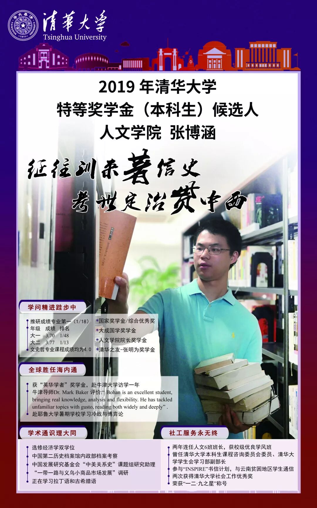 推研成绩专业第一,文史哲专业课程成绩均为4.0,张博涵曾获国家奖学金、人文学院院长奖学金、清华大学综合优秀奖等等。